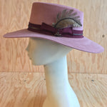 Antique Pink rabbit fur felt telescope crown hat with grosgrain band and bow, lambskin trim. Handmade straw feather trim. Brim size: 3 1/2” Custom made orders for XS, XL and...