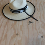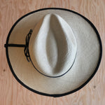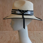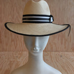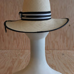Natural straw panama hat woven by hand with Colombian toquilla straw, trimmed with with black and light grey grosgrain bands, and black lambskin trim.