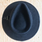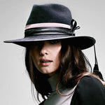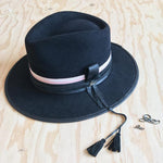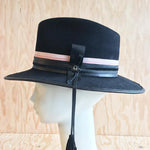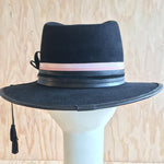 Fedora Hat in black rabbit fur felt with two-tone pink grosgrain band, black lamb and cow skin trim.   Black suede tassel. Brim width: 2 7/8” Custom made orders for...