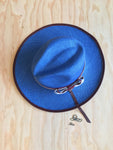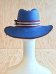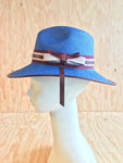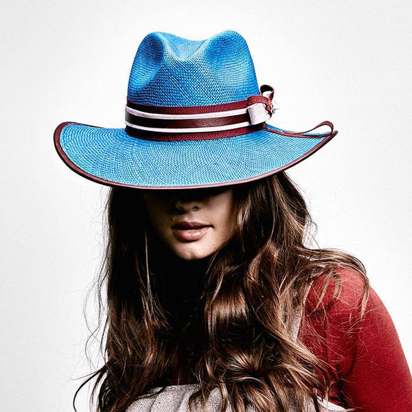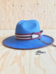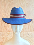 Royal blue panama hat woven by hand with Colombian toquilla straw, trimmed with burgundy and light dusty pink grosgrain bands, and burgundy lambskin trim.  Burgundy lambskin trim around brim edge....