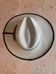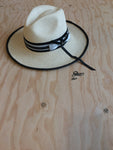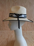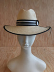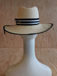 Natural straw panama hat woven by hand with Colombian toquilla straw, trimmed with with black and light grey grosgrain bands, and black lambskin trim. Black lambskin trim around brim edge. Brim...