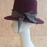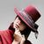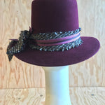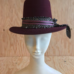 Burgundy rabbit fur felt with Italian wool bias band, light blue silk, and navy blue lambskin trim.