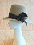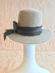 Camel long hair rabbit fur felt with Italian wool bias band, plum silk and treated olive green lambskin trim. Brim size: 2 1/2” Crown height: 5 1/2” Custom made orders for XS, XL...