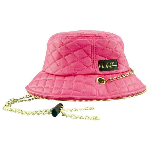 Pink Quilted Faux Leather Bucket Hat With Gold Chain Strap.